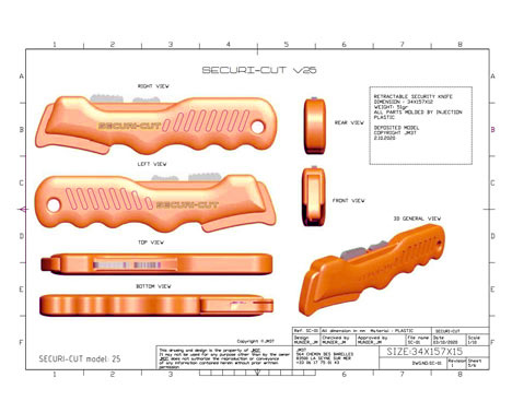 Cutter de sécurité à lame auto-rétractable biodégradable, fabriqué à partir de plastique recyclé. Il se compose d’une lame de grade d'acier SK5. La lame n’est pas changeable, conformément au Code du travail et lois en vigueur. Conçu selon les conseils et recommandations de la CARSAT. Pas de manipulation à risque pour les utilisateurs. Il est doté d'un cran de sécurité à l'arrière du bouton de sortie de lame. Ce cran de sureté ne sert en aucun cas à bloquer la lame en position "Sortie", il peut être actionné lors de sa non-utilisation, dans les espaces publics avec tiers environnants, ou en fin de journée de travail lors de son rangement. Le Sécuricut est ambidextre et ergonomique, réduisant les TMS (Troubles Musculo-squelettiques des mouvements répétés).